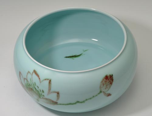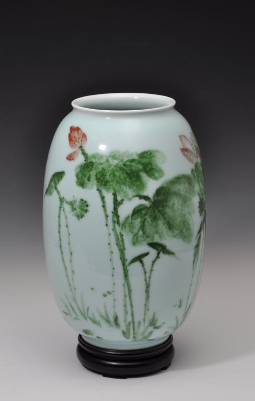 作品“青清荷坛”釉色青翠匀净,线条明快流畅,似与绿荷有约,清澈淡雅,粉色的荷苞竞欲绽放,深绿的荷叶默默相扶。底座浅浅意为污泥,出污泥而不染的坚韧挺拔之荷意境斐然,可发奇想联翩。