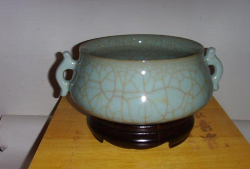 陈少青对运用龙泉青瓷哥弟混合、写意装饰方法有开发性创举。作品《宣德炉》造型古朴庄重,高贵雅致,光泽温润,冰裂纹自然生动,双耳匀称妥帖,是难得的一件龙泉青瓷尚品。