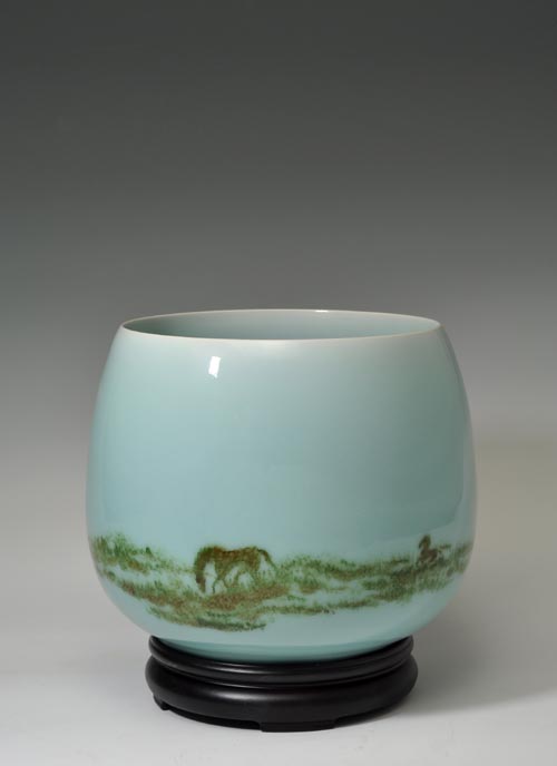 我所接触的陈少青在艺术与生活上表现出相当程度的成熟,乍看像一个地道靠谱的中学老师,谦和,彬彬有礼;矜持,不卑不亢。她成熟但并不世故,所体现的成熟或可以教人更高度化地品味她做人的从容和从艺的从容;她能够光荣成为“浙江省巾帼建功标兵”和“第13届浙江省妇女代表”,足以说明陈少青的人品也还是可圈可点可赞可敬的。对这样一个醉心于青瓷事业的女人,自然应该探究一下她如何处理生活与艺术的矛盾?陈少青的回答明确而坦然:在她的观念里,生活和艺术都是自己的心情花园,不会分的太清,追求生活时以平和平静来诠释分享、追求艺术时以静谧美好来推崇向往。品读陈少青的作品总能够让人在视觉的雅致、悦目、清新表象里,感受其内心深处留下的滚滚暖流;同时感觉能够在她的作品中读出始终淋漓尽致展示现代女性对于美好的细腻刻划与顽强的独立意识的渴望。